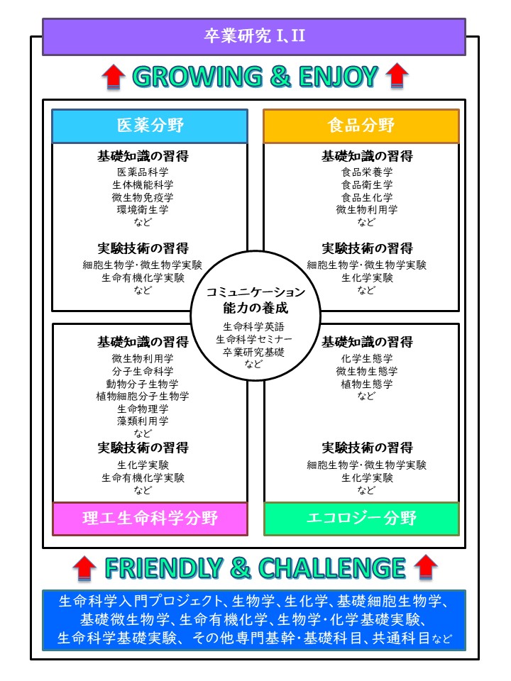 このような時代背景から、2013年4月に理工学部に生命科学コースをスタートさせ、その後、微生物から植物、動物までの生物全般を対象に、基礎研究から応用分野まで幅広く学べるコースを発展させてきました。現在10名の教員とスタッフが所属し、少人数指導と相互コミュニケーションを基本としたきめ細かな教育により、社会に必要とされる人材育成を行っています。